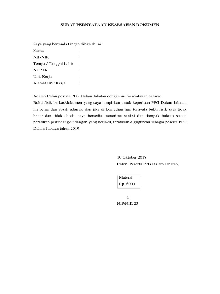 Seperti surat pernyataan kerja bermaterai, perjanjian, dan pernyataan belum menikah. Ada satu jenis surat yang sangat penting yaitu surat pernyataan keaslian dokumen. Demikian contoh format surat pernyataan keabsahan dokumen (ppg/ ppgj) dalam jabatan tahun 2019 yang dapat saya bagikan, smeoga bermanfaat. Apakah surat pernyataan hanya ini ? Apabila surat pernyataan ini tidak benar, maka saya bersedia diberi sanksi akademik yang ditetapkan oleh pimpinan fakultas atau pimpinan universitas lampung.